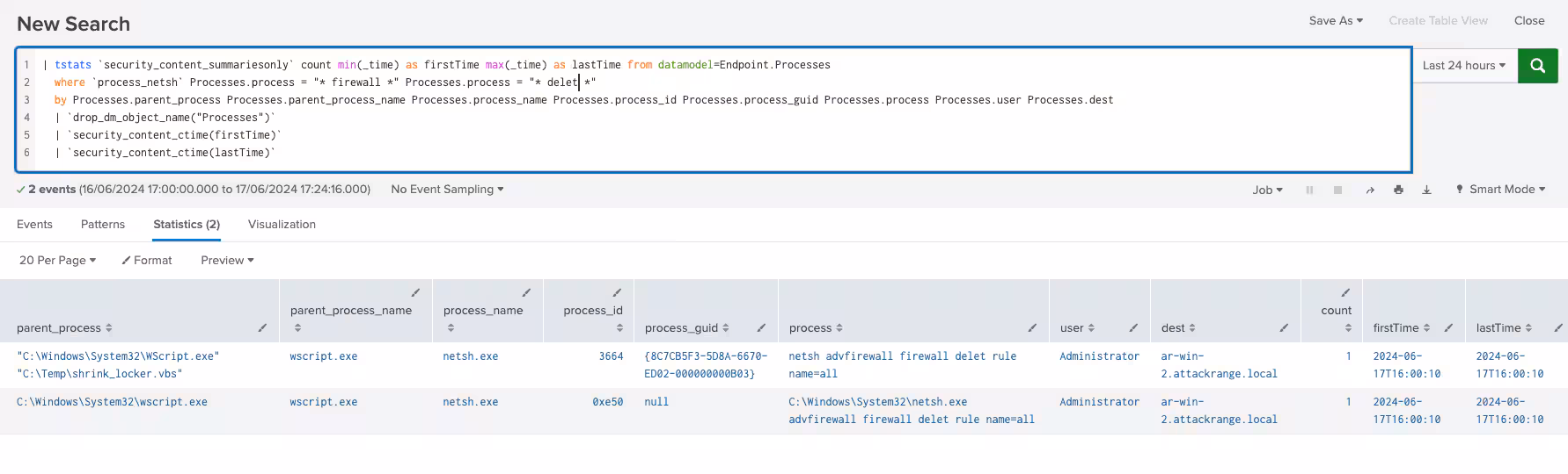 where `process_netsh` Processes.process = "* firewall *" Processes.process = "* del*"