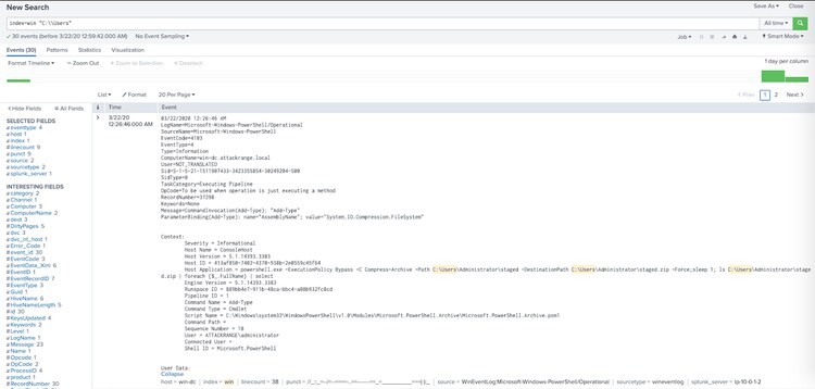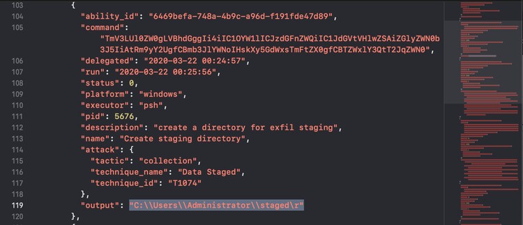 As we can see in the above figure, the Caldera interface provides visual feedback as the abilities are being performed. Once the abilities have finished to execute we can download a report for further inquiry or we can simply look at the Splunk instance. Let’s look for one of the items in the above operations; specifically let’s look for “Create stage directory” or Mitre ATT&CK T1074. This technique involves the creation of a local directory for exfiltration purposes. Look for commands that indicate the creation and writing of data to a newly created directory as displayed in the following Splunk screen capture.