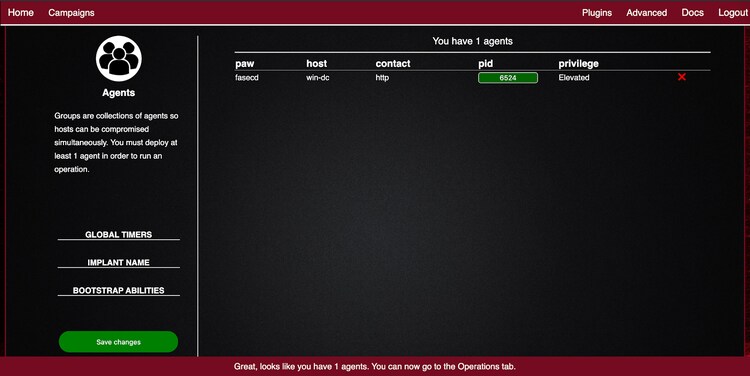 Once we have the machines online, we can access them and start applying simulations either via command line (Atomic Read Team) or we can do it via the Caldera interface which runs under port 8888 at the Splunk server machine. Once the deployment is complete, browse to your Splunk server at port 8000 or to the Caldera adversarial simulation engine at port 8888. The Caldera agent should also be deployed to the Windows machine — in this case, the windows domain controller. You can navigate to the ‘agents tab’ to confirm, as shown in the following graphic.