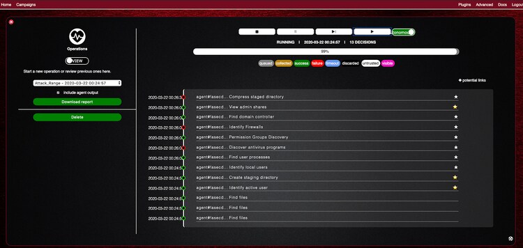 Initially the Splunk Attack Range included Atomic Read Team, which quickly allows you to execute attack and detection tests based on MITRE ATT&CK framework. This data is then fed to the Splunk server where the operator can visualize attack data and craft detections. A recent addition to the Splunk Attack Range is the Mitre Caldera adversarial simulation framework.