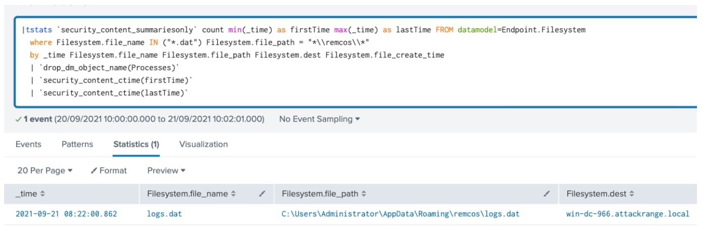 where Filesystem.file_name IN ("*.dat") Filesystem.file_path = "*\\remcos\\*"
