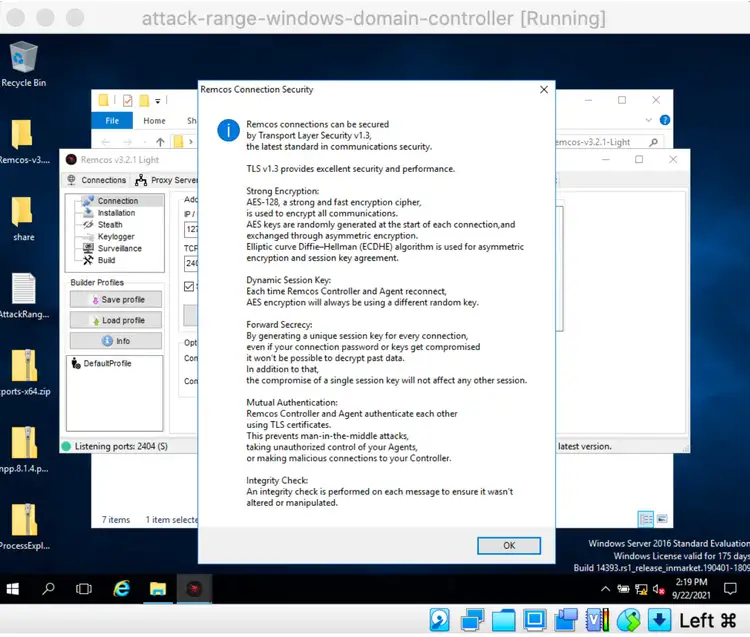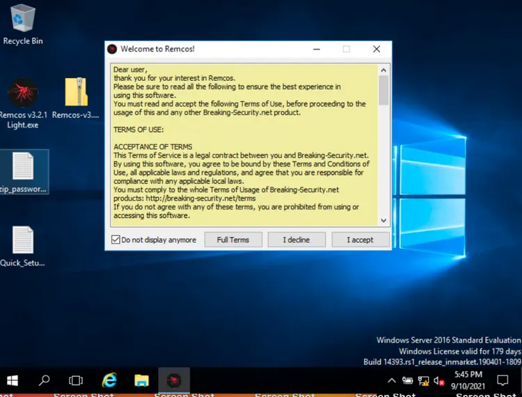 We decided to try to run a well-known Remote Access Trojan (RAT) called Remcos used by FIN7. This tool has been around for some time and has a reputation for being stealthy and effective in controlling compromised hosts. Sold as a remote computer monitoring tool, this tool has plenty of features that can allow an operator behind the control to do multiple operations against a compromised system.