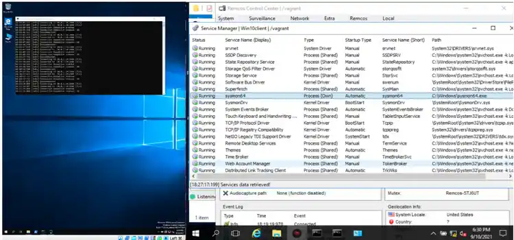 Remcos agent also communicates with the control panel using encryption via TLS v1.3 certificate, created during setup. Once we are able to transfer and execute the agent we can see how powerful this tool is against a compromised host. In the following screenshot, we can see one of the functions retrieving all services present at the compromised machine. This allows the operator to disable any of the running services. For example, the operator may choose to disable the sysmon service so that logs are no longer collected.