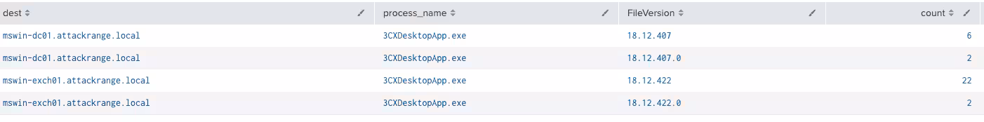 Initially, like many, we want to identify endpoints across our fleet that have C3XdesktopApp running and what version. We decided to use the Endpoint.Processes datamodel so the results would be back fast. If data is not normalized in the datamodel, that’s ok! Modify the analytic for your environment by looking for the process names. Note here that the datamodel does not provide file version, we are specifically just looking for where this process is running across the fleet.