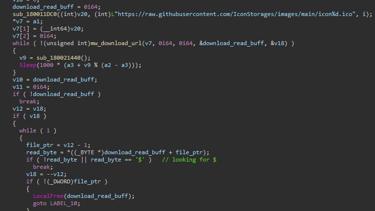 Figure 4 presents a code snippet of the decrypted DLL that attempts to download multiple .ico files for decoding and decryption. The code highlights an intriguing approach employed by the attacker, using .ico files as configuration files. After downloading the .ico files, the shellcode reads them byte by byte, searching for the character "$". This character serves as a marker for the encoded and encrypted C2 URL link.