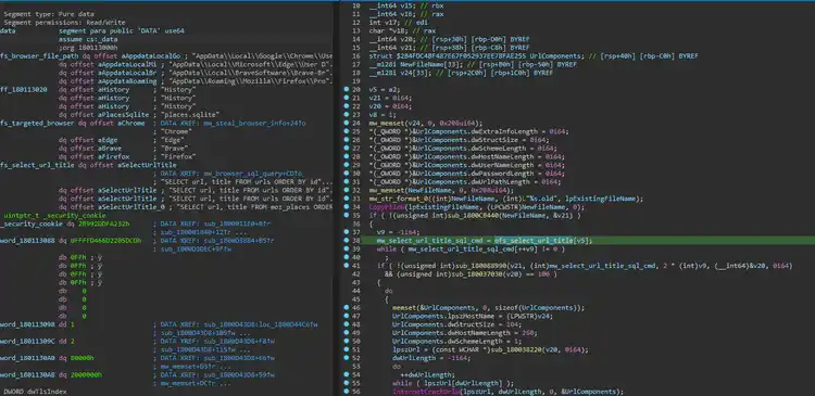 Finally, the malware targets several well-known browsers, including "Chrome," "Firefox," "MSEdge," and "Brave," in order to steal information. It achieves this by accessing browser history and the places.sqlite database, copying it, and then querying the discovered SQLite browser databases to parse the URL and title, limited to the first 500 entries. Figure 7 displays a code snippet illustrating how the stealer executes the SQL command once it locates the browser SQLite database it needs to parse and subsequently sends the information to its C2 server.