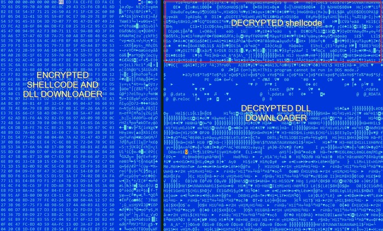 The shellcode is encrypted using the RC4 algorithm, with a specific decryption key "3jB(2bsG#c7". Figure 2 illustrates the encrypted code block embedded in d3dcompiler_47.dll before and after the decryption process. Upon examining the decrypted portion of the screenshot, it becomes evident that the shellcode contains instructions to load another DLL.