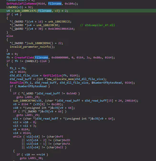 The patched ffmpeg.dll is responsible for reading another DLL named "d3dcompiler_47.dll," which contains an encrypted shellcode and additional DLLs that will download several .ico files. Figure 1 presents a code snippet of the maliciously crafted ffmpeg.dll that reads the "d3dcompiler_47.dll" file to search for an embedded encrypted shellcode, starting with an 8-byte sequence "0xFE 0xED 0xFA 0xCE 0xFE 0xED 0xFA 0xCE."
