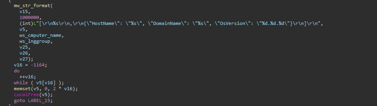 The browser stealer is a separate x64-bit DLL that executes its malicious code through the "DllGetClassObject" export function. This malware aims to extract information such as domain name, computer name, and OS version using the NetWkstaGetInfo() and RtlGetVersion() APIs. Figure 6.1 and 6.2 display code snippets illustrating how the malware retrieves the specified information using these two Windows APIs and formats it before transmitting the data to its C2 server.