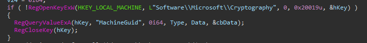 The shellcode proceeds to load the decrypted DLL export "DllGetClassObject," which initiates a thread to examine the manifest file. It then sleeps for a duration based on a randomly generated value relative to the system date and time. Following this, it reads the machine GUID from the registry. Figure 3 demonstrates how the shellcode accesses the Cryptography registry to parse the MachineGUID of the targeted or compromised host.