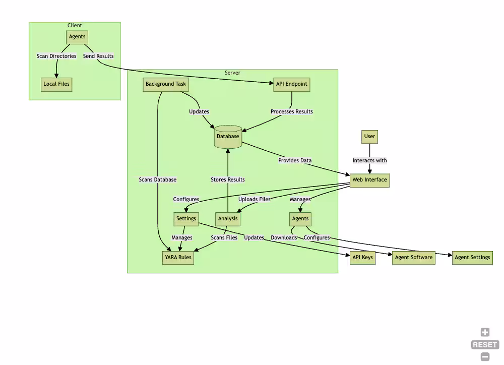YARA scanning is performed at two key points in the system: during file upload and as a background task to scan previously analyzed files.