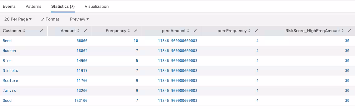 index=transactions sourcetype=transfers | eval Amount=log(Amount)|eventstats perc90(Amount) as percAmount perc90(Frequency) as percFrequency|where Amount>percAmount and Frequency>percFrequency |eval RiskScore_HighFreqAmount=30 | table Customer Amount Frequency percAmount percFrequency RiskScore_HighFreqAmount