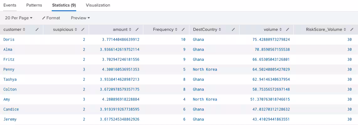 What if we used three variables instead of two? We’ll use wire transfer data in the next example and add a suspicious country score. All countries will get an initial score of 1 and if they are suspicious, they will get a score of 2. A really suspicious country will get a score of 3. Our formula will now be amount * Frequency * suspicious. This will compute a virtual cubic volume. If the virtual cubic volume is over a predefined threshold, this entity should get a risk score just like we did before. In the next SPL example, we artificially provide a suspicious risk rating using a case statement for each Country in the dataset with a default rating of 1. (The assignment of 1, 2, and 3 could have been done in any way preferred by the writer of the SPL as this example is just for illustration.)