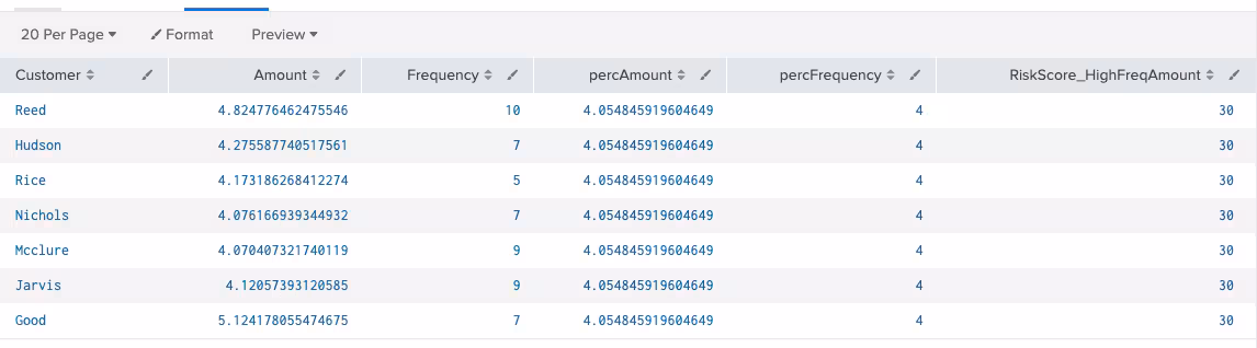An arbitrary risk score is added to the end to send to a risk index for further processing. For the purposes of this example the risk score is arbitrary, but your risk score in real life is based on your own usage and normalization techniques according to what suits your use case. In this example, all customers who are over the 90th percentile for amount and frequency are flagged. Because the amount can be magnitudes larger than the frequency value, we can use the log function to bring the amount value within the same magnitude as the frequency. There are other ways to do this such as using a StandardScaler function in machine learning, but we will keep it simple by using log here.
