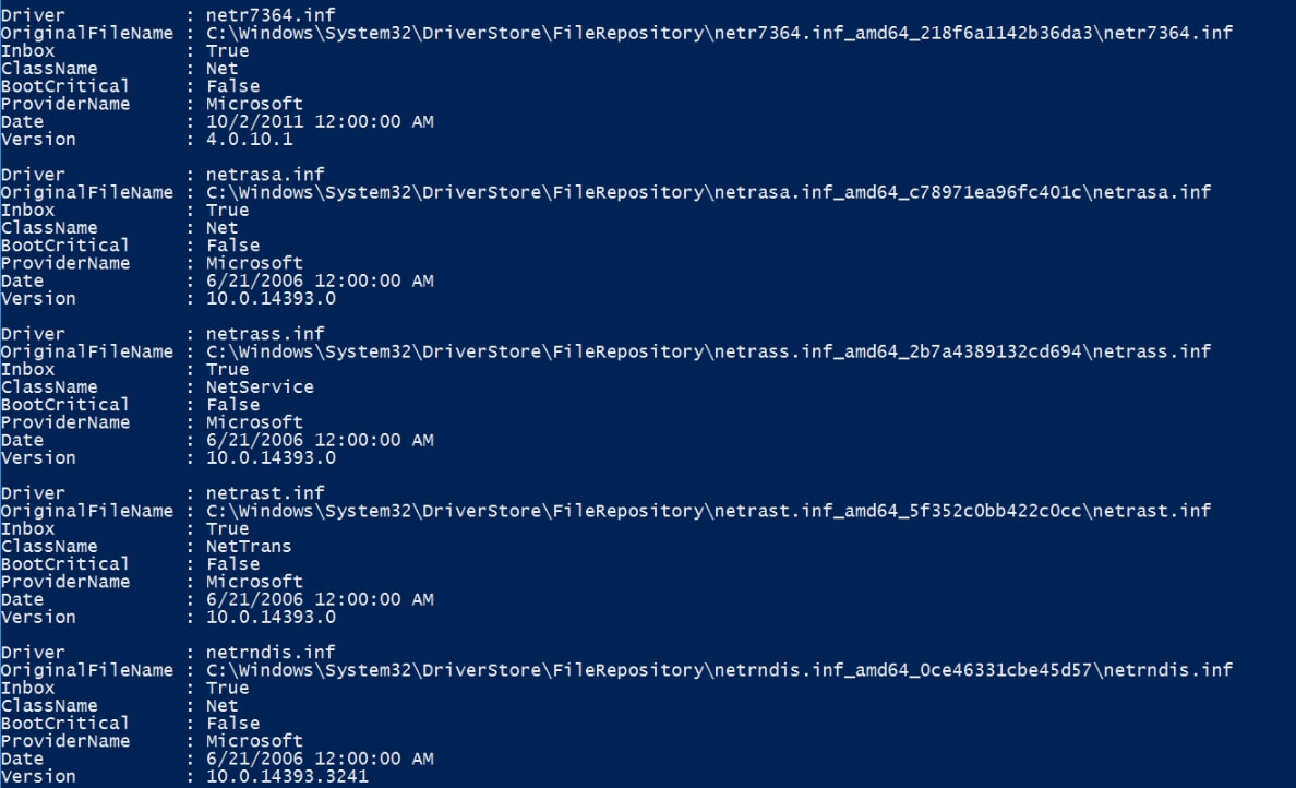 PowerShell natively provides a cmdlet - Get-WindowsDriver - that allows you to view all drivers installed. This cmdlet at first seems great, but it may be slow to run on systems with many drivers. During STRT testing, outputting to a CSV is not perfect, however some utilities may provide a better visual using this cmdlet.