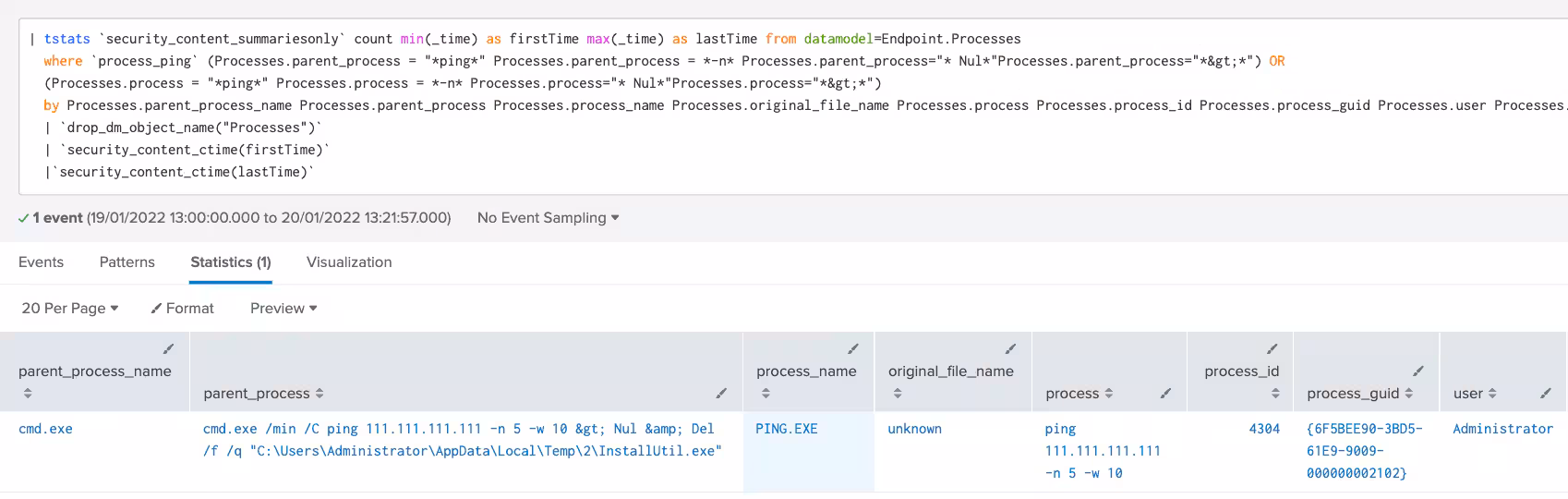 (Processes.process = "*ping*" Processes.process = *-n* Processes.process="* Nul*"Processes.process="*>*")