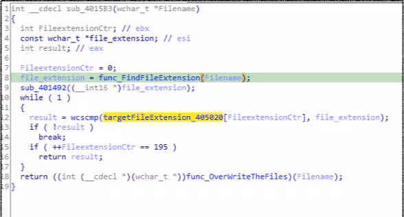 If it finds a file during its enumeration, It will convert its string filename in all capital characters then check if the file extension is in its list. Below is the screenshot of code that checks the file extension and the list of its targeted file type.