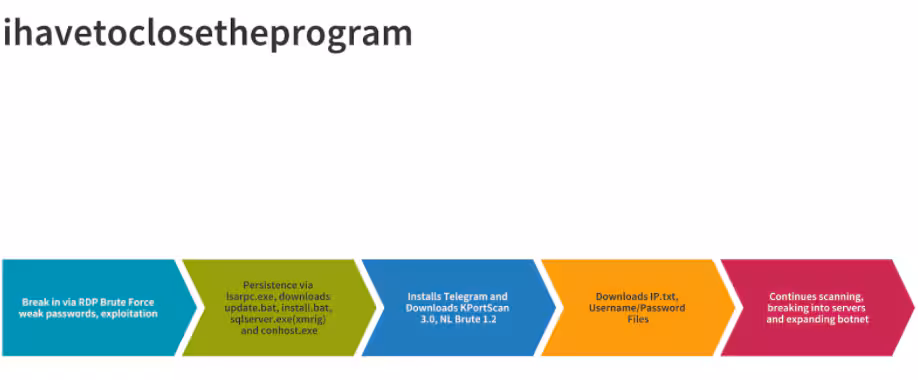 In a typical attack with Crypto Botnet on Telegram, threat actors first break into Windows Servers and proceed to install several tools found in hacking forums such as NL Brute, KPort Scan and NLA Checker. All these tools target Windows servers with weak passwords using RDP protocol brute force tools. And after the threat actor is able to break in and download further exploitation tools as mentioned above, they will install Telegram Desktop, which is being used as part of the Command and Control Infrastructure and used to drop cryptomining tools such as minergate and xmrig. Both of these binaries are identified as monero (xmr) cryptomining tools.