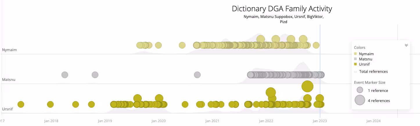 A Recorded Future timeline on the current state of dictionary DGA-related cyber events shows a long history of activity, and helps us identify popular malware families (Nymaim, Matsnu, Ursnif) that have steadily employed this technique over the past few years: