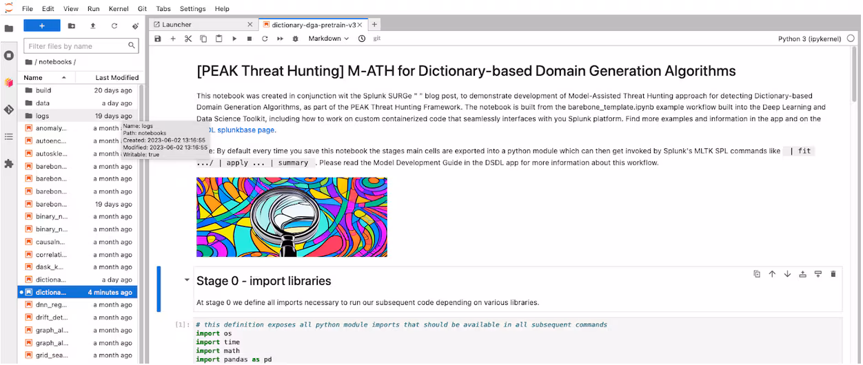 In this post, we’ll dive deeper into dictionary-based DGA as a specific example to demonstrate how you can develop your own model-based hunting, or apply a pre-trained model through Jupyter Notebooks to hunt your Splunk data, all while following the M-ATH process we’ve established for the PEAK Threat Hunting Framework. Building this type of hunt yourself requires some knowledge of data science, but the pre-trained model can be deployed without any development effort. The goal of this post is to offer a blueprint of the development process, and tools available, to make the topic more accessible to those who have an interest!
