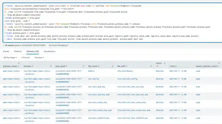 where Filesystem.action=deleted Filesystem.file_path = "/etc/ssh/*" AND Filesystem.file_path = "~/.ssh/*" by _time span=1h Filesystem.file_name Filesystem.file_path Filesystem.dest Filesystem.process_guid Filesystem.action