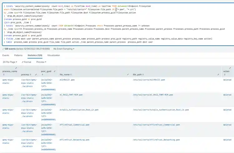 This analytic looks for a deletion of ssl certificate in a linux machine. attacker may delete or modify ssl certificate to impair some security features or act as defense evasion in a compromised linux machine. This Anomaly can be also a good indicator of a malware trying to wipe or delete several files in a compromised host as part of its destructive payload like what AcidRain malware does in linux or router machines.