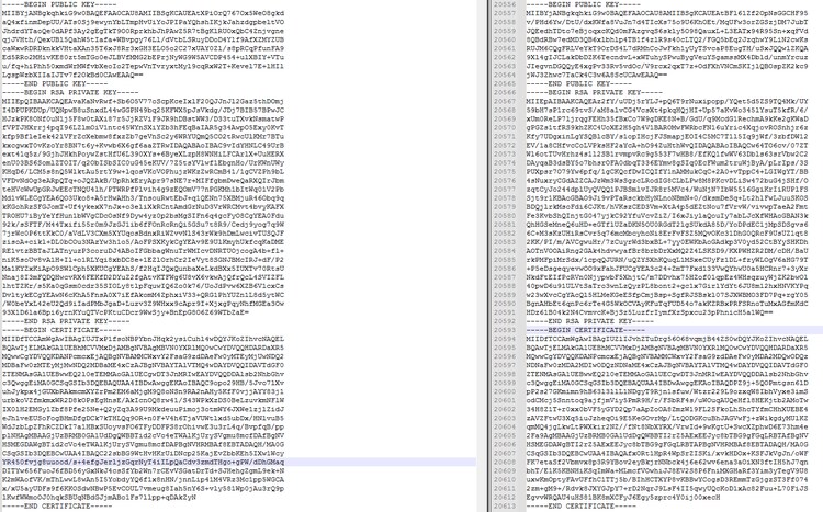 Below is the screenshot of public keys, private keys, and the x.509 certificate we found in 2 Cyclops Blink malware we’ve analyzed.