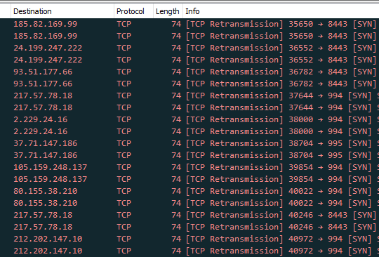 We also saw some of its C2 IP addresses that it tries to connect to during our analysis. Below is a screenshot of wireshark capturing the initial TCP traffic of its initial connections to some of its C2.