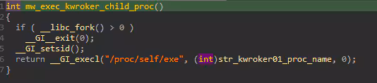 This malware will check if its current process starts with “[kw” if yes it will check again if it is “[kworker:0/1]” . If not it will reload itself by creating a child process using “execl(“/proc/self/exe”. “[kworker:0/1]”) function like the code snippet below shows.
