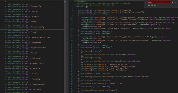 This malware is a .net compiled binary that has a customized obfuscation and a large amount of junk code that makes analysis harder to accomplish. Before performing its destructive functions it will list several directory names and paths where it will look for files it will wipe.