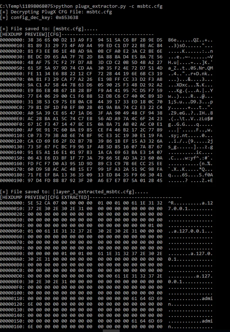 Automated Decryption: Once in place, it operates as a sophisticated decryption mechanism. It diligently decrypts the concealed, compressed payload and configuration files that constitute the heart of the PlugX malware. This decryption process is initiated seamlessly upon the execution of the legitimate "msbtc.exe."