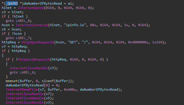 In addition to the aforementioned actions, it will make an attempt to gather network-related information from the compromised host by initiating queries to the ipinfo.io website. This data collection process involves retrieving details about the host's external IP address, geographical location, Internet service provider, and other relevant network-related parameters. By querying ipinfo.io, the malware aims to build a comprehensive profile of the compromised host's network environment, which can be further utilized for various malicious activities or information gathering.