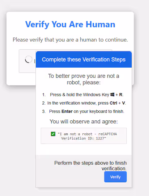 - Social Engineering: Users are then presented with instructions claiming they need to perform additional verification steps such as pressing Windows+R followed by Ctrl+V.