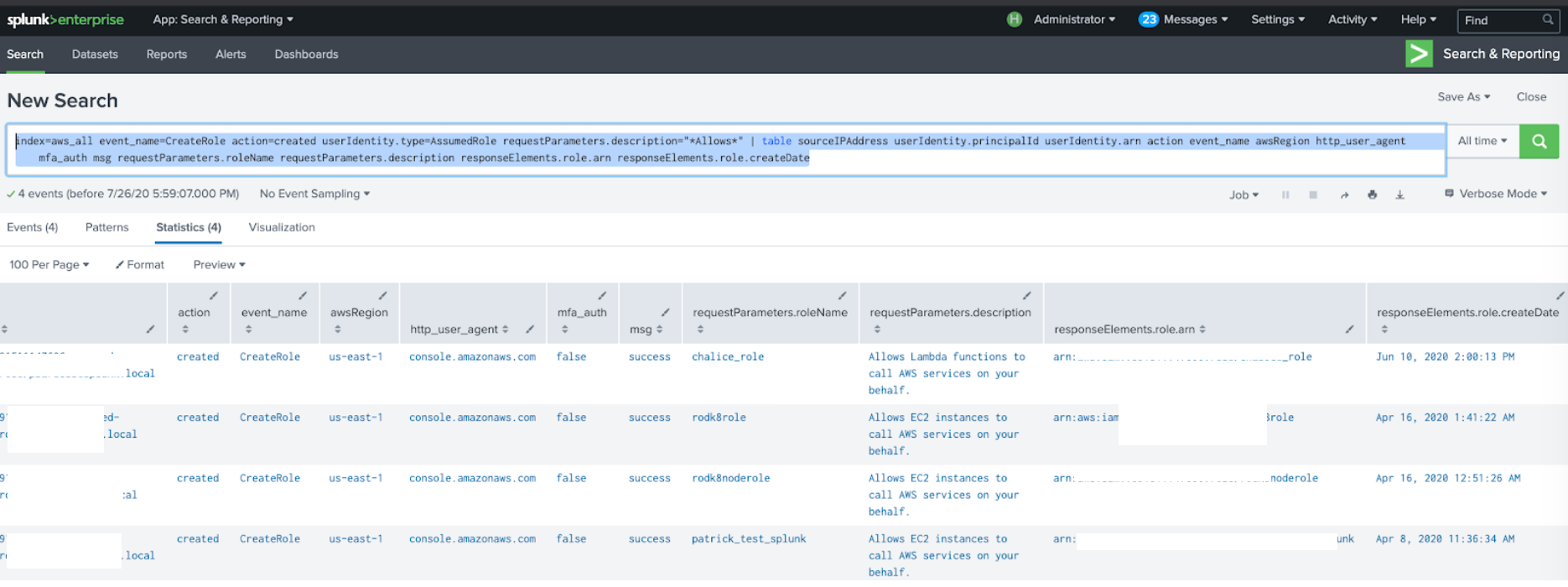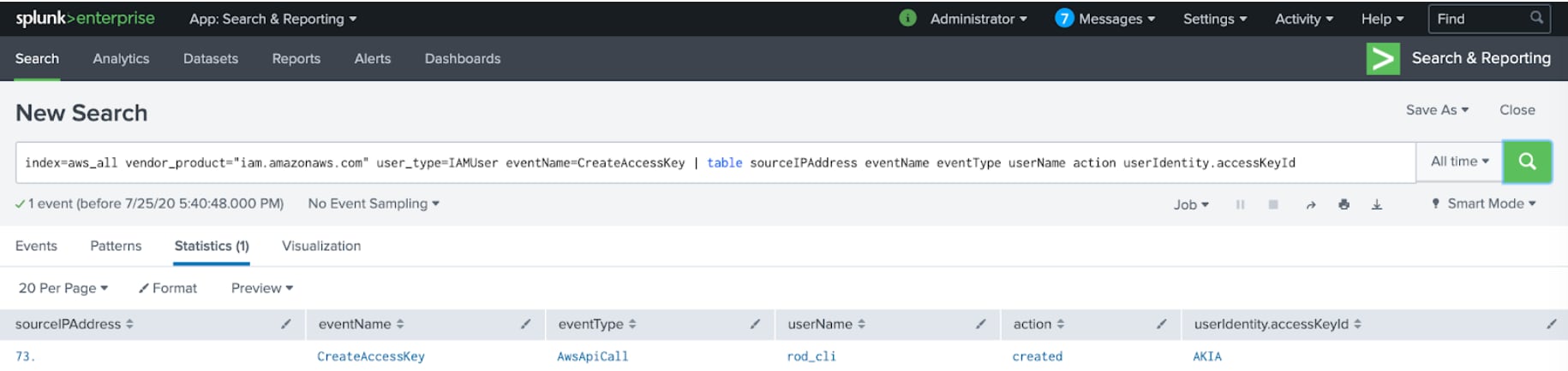 Notice that we are excluding userIdentity.type!=AssumedRole which relates to temporary credentials so we can find specifically what user from IAM is creating permanent keys. Also notice we are getting a user agent which gives clues about operating system type and software frameworks. We also get when the keys were created, the actual key and the status of such keys.