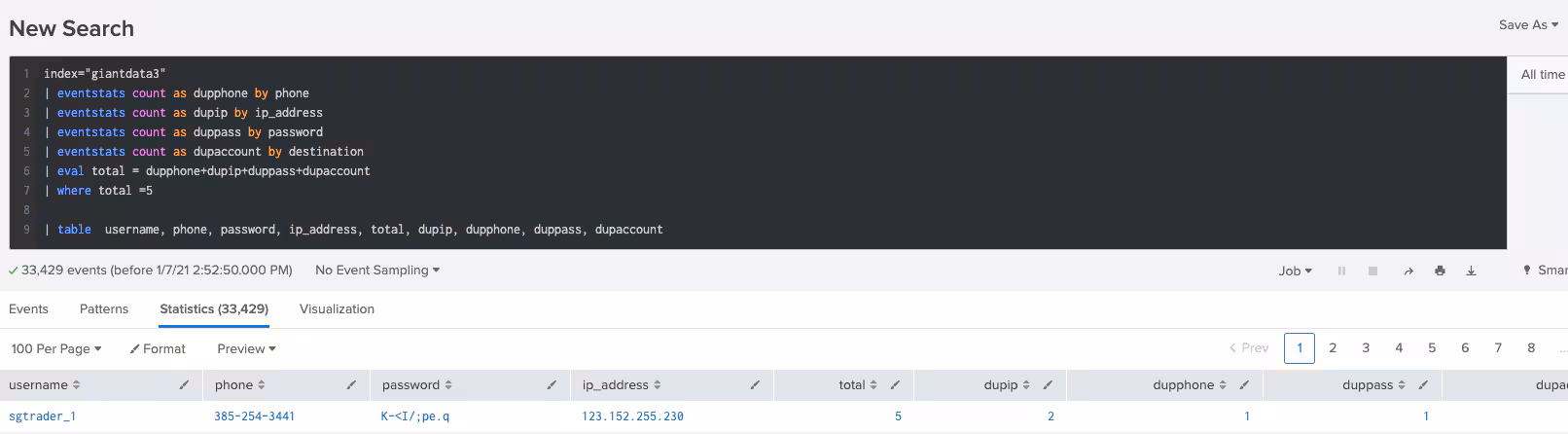 | fields total, username, phone, password, ip_address, destination, total, dupphone, dupip, duppass, dupaccount