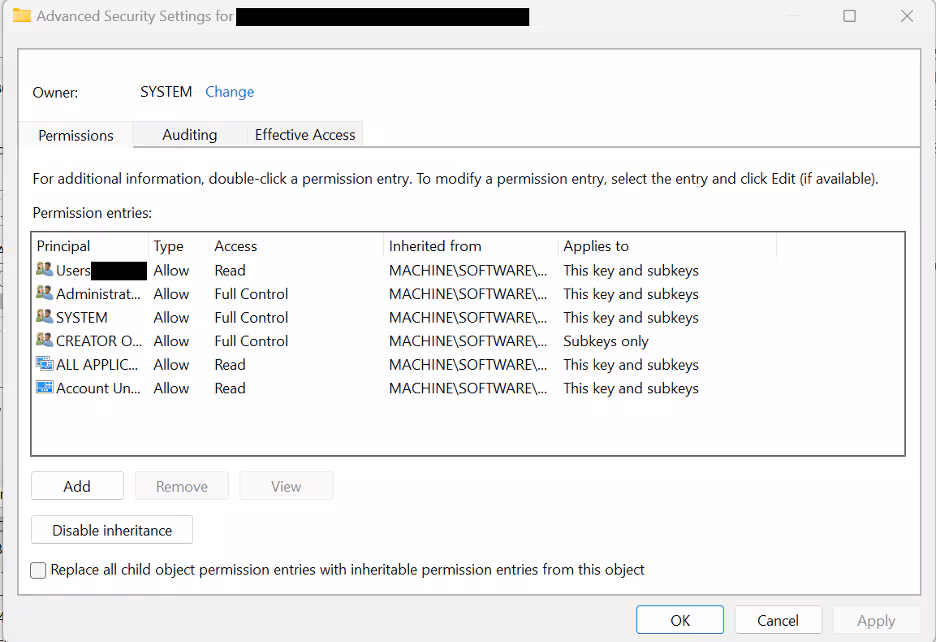 Table (no-header) D:(A;;FA;;;BA)(A;;FA;;;SY)(A;;0x1200a9;;;BU) Registry Keys