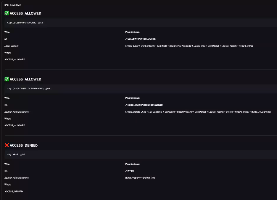 - For Security Teams: Quickly analyze SDDL configurations across your environments to identify potential misconfigurations or overly permissive settings