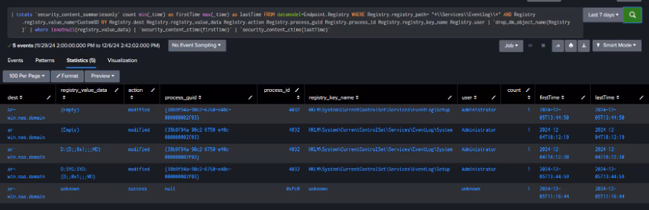 To detect this type of event log tampering through SDDL modifications, the Splunk Threat Research Team has developed detections and atomic tests specifically targeting changes to Windows Event Channel permissions. The Windows New Custom Security Descriptor Set On EventLog Channel detection will alert when an adversary attempts to modify channel access descriptions, helping defenders identify potential event log tampering early in an attack: