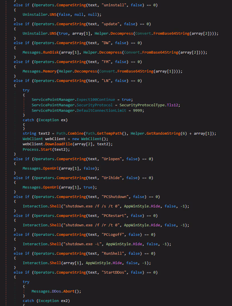 XWorm includes a function that processes backdoor commands received from its command-and-control (C2) server, as shown in Figure 23. These commands include actions such as shutting down or restarting the system, downloading files, opening URLs, initiating DDoS attacks, and more.