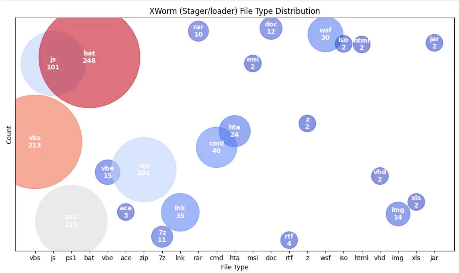 Aside from that, One of the more interesting aspects of recent XWorm campaigns is the use of varied stagers and loaders tailored to bypass detection and improve delivery efficiency. Unlike traditional malware that often relies on a fixed infection chain, XWorm leverages a dynamic approach, cycling through multiple file formats and scripting languages such as PowerShell, VBS, .NET executables, java script, batch script, .hta, .lnk, .iso, .vhd, .img and even Office macros to stage and load its payload. This adaptability not only complicates detection but also suggests a deliberate strategy to evade endpoint defenses and sandboxing tools.