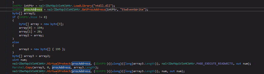 The second decrypted file also attempts to tamper with Windows Event Tracing for Windows (ETW) by patching the EtwEventWrite() function. ETW is a built-in logging framework used by the operating system and security tools to monitor and collect detailed runtime information about system and application behavior. By patching EtwEventWrite() in memory, the malware effectively disables or suppresses ETW logging, allowing its malicious activities to proceed without being recorded or detected by event monitoring tools.