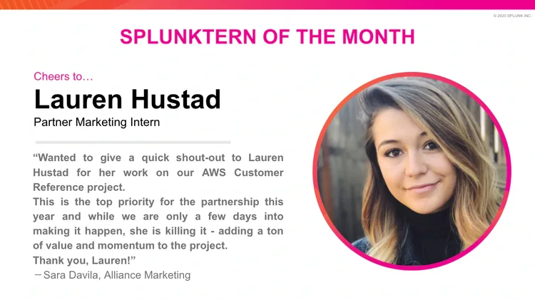 In this next installment of our “Meet the Splunktern'' series, we’re featuring Lauren Hustad, our Partner Marketing Demand Generation intern. Lauren is currently a marketing student at the Kelley School of Business at Indiana University. Recently, Lauren was named Splunktern of the Month! Read on to learn more about Lauren and her Splunktern experience.