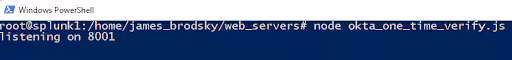 Now, you can run the one-time-verification step. Start your temporary webserver like so (I called this file okta_one_time_verify.js):