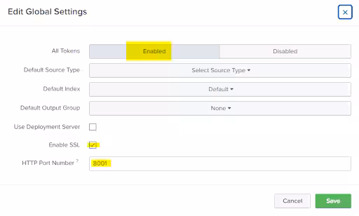 - Set up HEC on your Splunk instance using SSL and choose a TCP port.