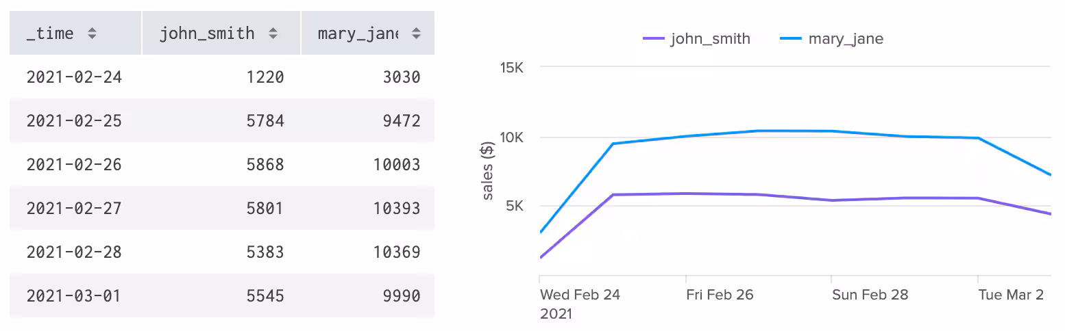 A basic time series chart can be displayed using the `timechart` command. For example, if you’d like to investigate which days of the week have the most sales: